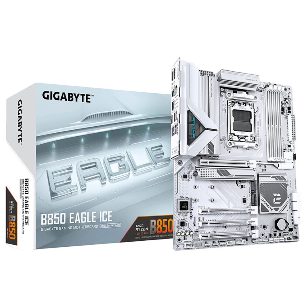 La carte mère Gigabyte B850 EAGLE ICE est animée autour du chipset AMD B850 ce qui la rend idéale pour poser les bases d'une configuration gaming. Grâce à son socket AMD AM5, elle prend en charge un processeur AMD Ryzen 7000/8000/9000. Dotée de 4 emplacements DDR5, la B850 EAGLE ICE est en mesure de gérer jusqu'à 256 Go. Sa compatibilité avec la norme PCI Express 5.0 permet d'exploiter les cartes graphiques et les SSD M.2 NVMe les plus récents pour des performances élevées. Elle bénéficie d'une connectivité complète avec du réseau LAN 2.5 GbE ainsi que de l'USB 3.0 et 3.1.