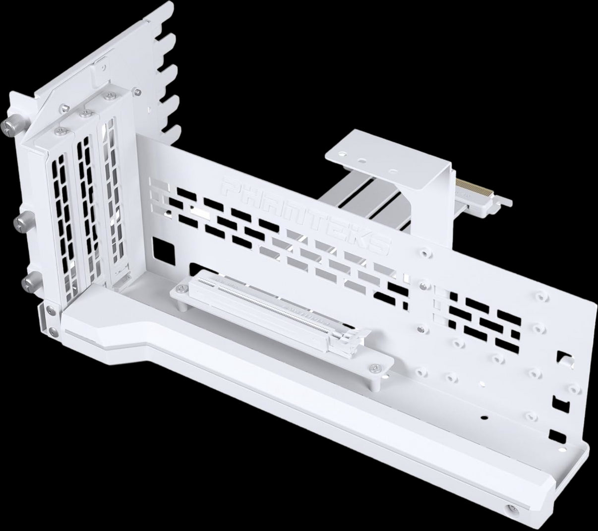 Le support de GPU vertical Premium noir de Phanteks permet de monter une carte graphique à la verticale dans le boîtier. Il combine flexibilité et style pour mettre l'accent sur la carte graphique. Le support est entièrement supporté en orientation verticale, mais peut également être ajusté jusqu'à 30° pour une présentation plus attrayante sur le plan visuel.